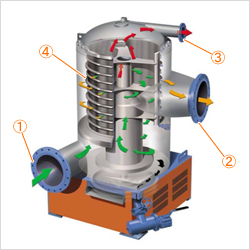 その構造は、処理液はスクリーンバスケット内側に導入され、φ0.20mmを通過できる液体、インキ粒子、灰分などはスクリーンプレートの外側に通過、通過できない繊維は回収繊維出口から連続的に回収されます。